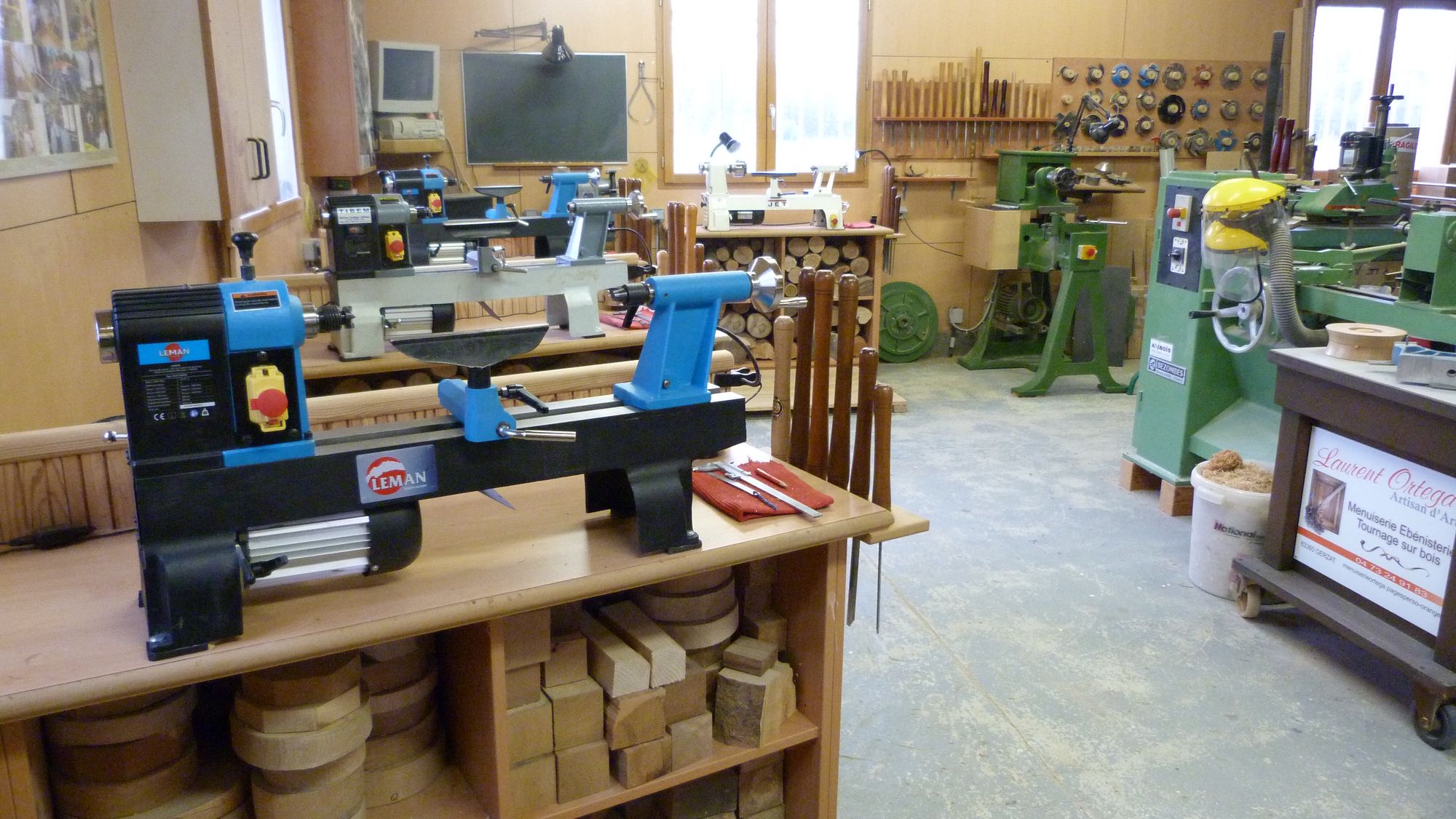 Équipé de 3 postes individuels de travail comprenant : 1 tour à bois frontal et 2 tours à bois à banc long de grandes capacités.